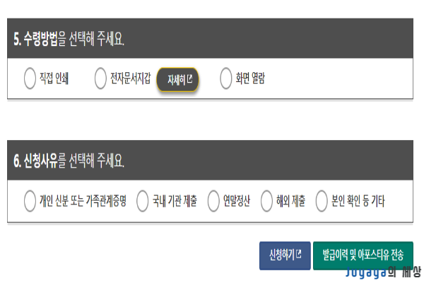발급대상과 증명서 종류, 수령방법, 신청사유 등을 체크한 후 신청하기 버튼을 누리면 가족관계증명서를 프린터로 출력할 수 있습니다.
