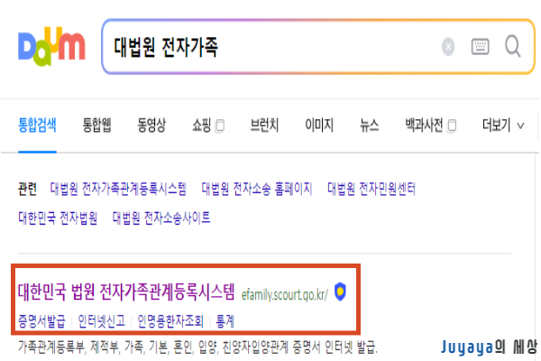 먼저 네이버 또는 다음 검색창에 대법원 전자가족이라고 입력 후 검색 버튼을 누릅니다.
