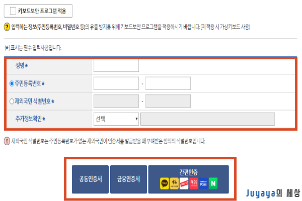 공동인증서와 금융인증서, 간편인증 등으로 진행할 수 있습니다.