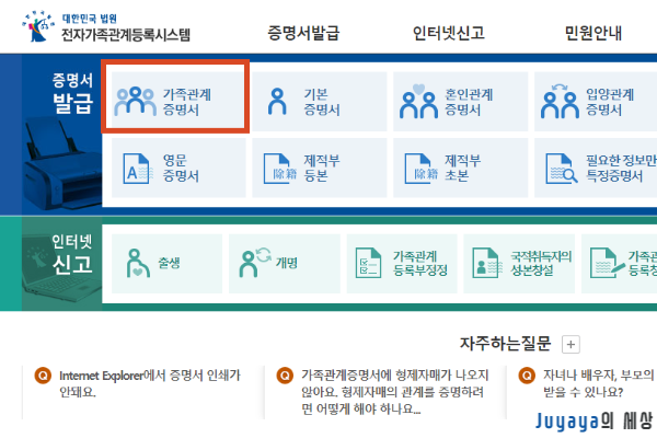 2. 가족관계증명서 발급 메뉴 클릭