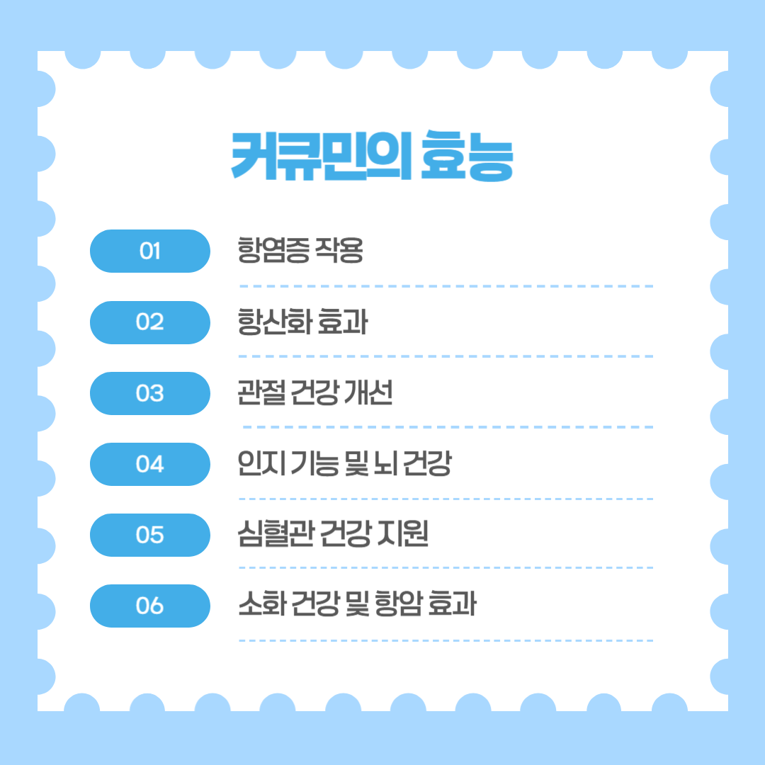 커큐민은 다양한 건강상의 이점을 지닌 성분으로, 특히 항염증과 항산화 효과가 주목받고 있습니다. 커큐민은 체내 염증 반응을 완화하는 데 도움을 주어 관절염, 심혈관 질환, 당뇨와 같은 만성 질환의 예방과 관리에 기여할 수 있습니다. 또한, 항산화 효과를 통해 자유라디칼로 인한 세포 손상을 방지하고 노화를 지연시키는 데 도움을 줍니다. 이로 인해 면역력이 강화되고, 전반적인 신체 기능이 개선될 수 있습니다.