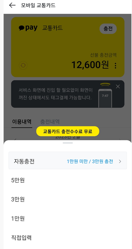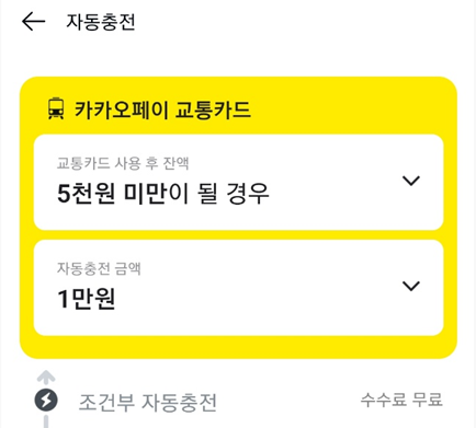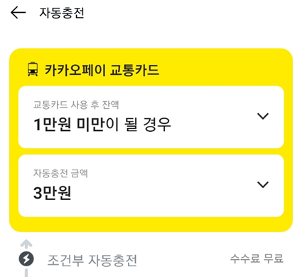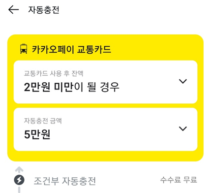 카카오페이 교통카드 자동충전은 잔액이 5천원 미만일 때, 1만원 미만일 때, 2만원 미만일 때 1만원, 3만원, 5만원을 자동충전하도록 설정할 수 있습니다.