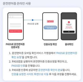 PASS에 등록한 운전면허증을 온라인에 사용하려면 운전면허증 모바일 확인서비스 가맹점에서 'PASS로 운전면허증 확인요청'을 선택하면 됩니다.