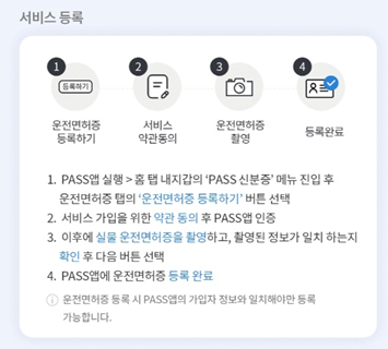 PASS앱에서 운전면허증을 등록할 수 있는 방법이 상세히 안내되어 있으니 지시한대로 따라하시면 어렵지 않게 등록할 수 있습니다.