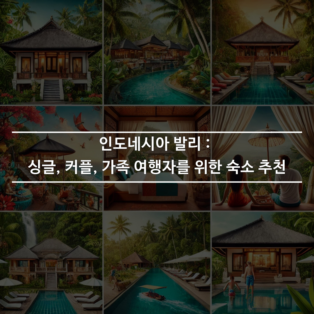 인도네시아 발리는 아름다운 자연, 다양한 액티비티, 그리고 독특한 문화로 여행자들에게 사랑받는 휴양지입니다. 여행의 목적과 동반자에 따라 원하는 숙소의 스타일도 달라지기 마련입니다. 이번 포스팅에서는 싱글 여행자, 커플 여행자, 그리고 가족 여행자를 위해 각각 3곳의 숙소를 추천드리겠습니다. 이 숙소들은 각 카테고리에 적합한 편의시설, 분위기, 그리고 위치를 고려하여 선정했습니다.