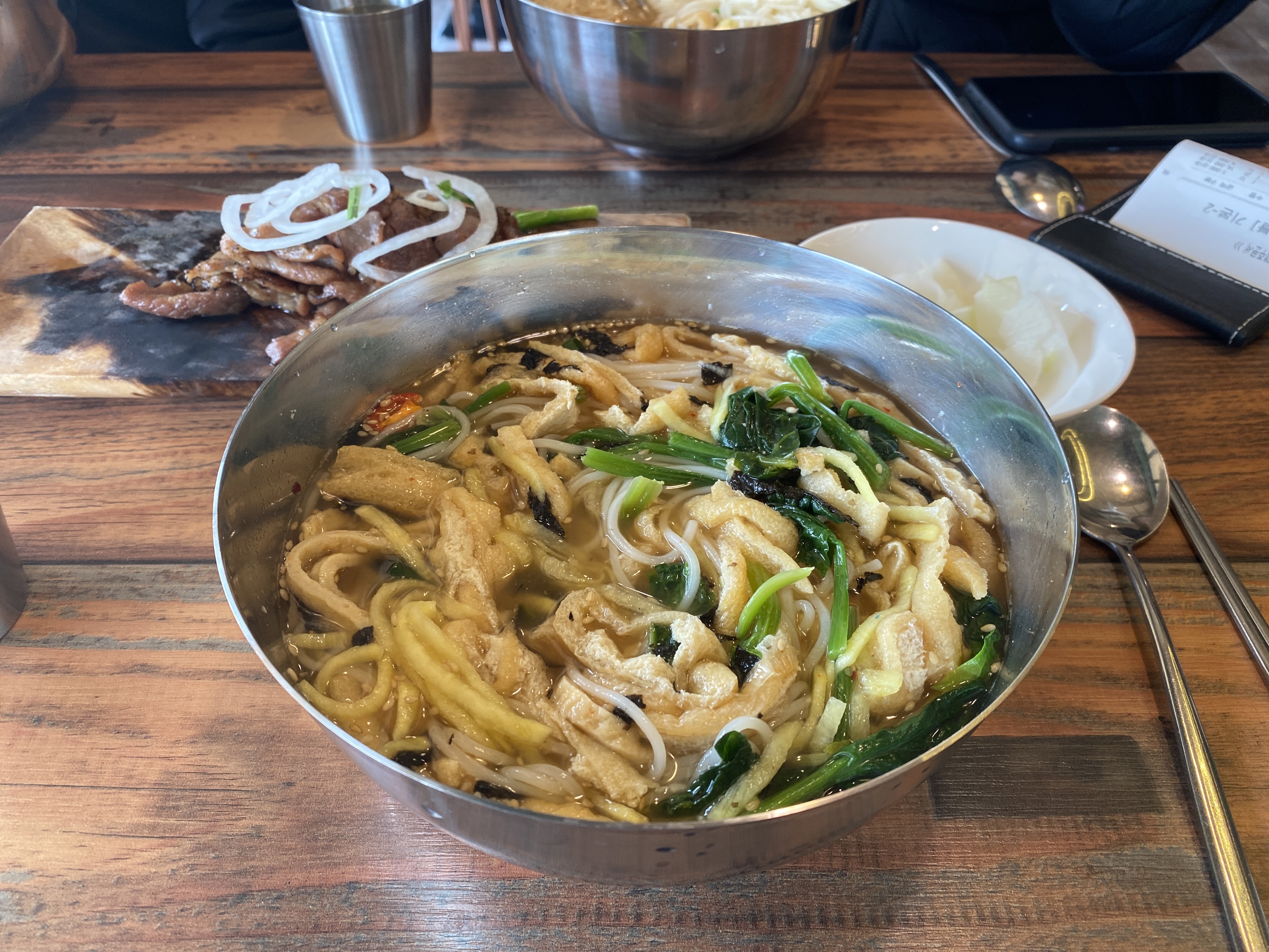 기본메뉴인 멸치국수(6,000원)와 비빔국수(7,000원)이 있고 멸치국수에 부추를 많이 넣으면 산더미부추국수(7,000원), 유부를 많이 넣으면 유부폭탄국수(7,000원)이 되는 것이다. 그 외에 여름을 겨냥한 묵국수(7,000원), 냉멸치국수(6,000원)도 있다. 국수와 밀면이 천대받는 혹독한 겨울을 이겨내기 위한 칼국수(7,500원)와 감자껄쭉이(8,000원)도 배치되어 있다.