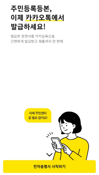 스마트폰의 카카오페이 메뉴로 접속하면 위와 같이 '주민등록등본 톡으로 5초만에 받기'라는 배너가 보이실 거에요.