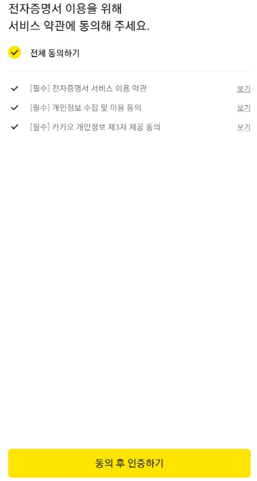 전자증명서 이용을 위해 약관에 동의한 후 인증하기 버튼을 누릅니다.