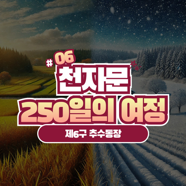 천자문 도전의 여섯 번째 구절에 오신 것을 환영합니다! 오늘 배울 구절은“秋收冬藏(추수동장)”으로, 가을과 겨울의 자연스러운 흐름을 통해 수확과 준비의 지혜를 상징합니다. 이번 구절에서는 자연의 순환에서 배울 수 있는 지혜와 이를 우리의 삶에 어떻게 적용할 수 있을지 알아보겠습니다.