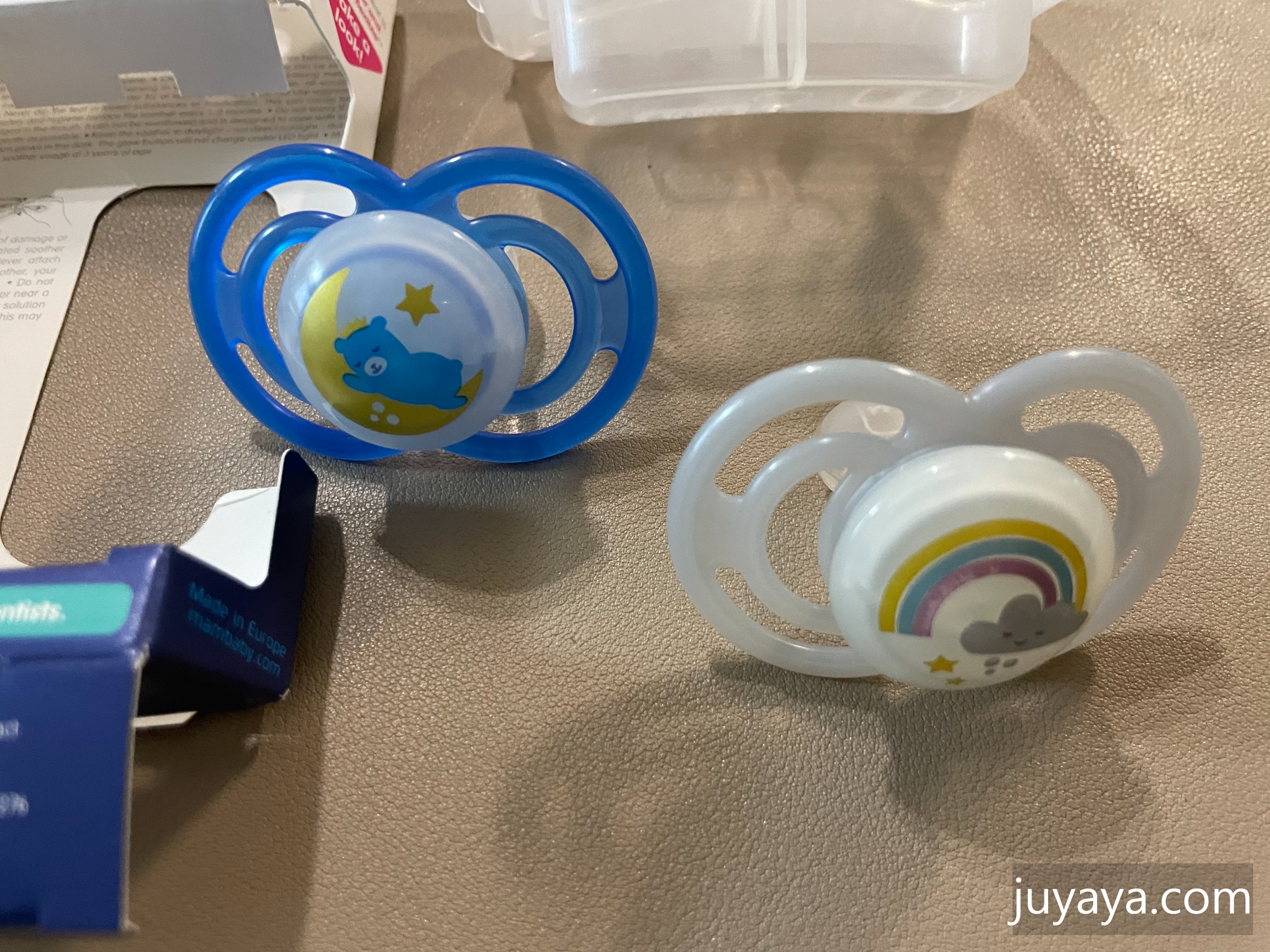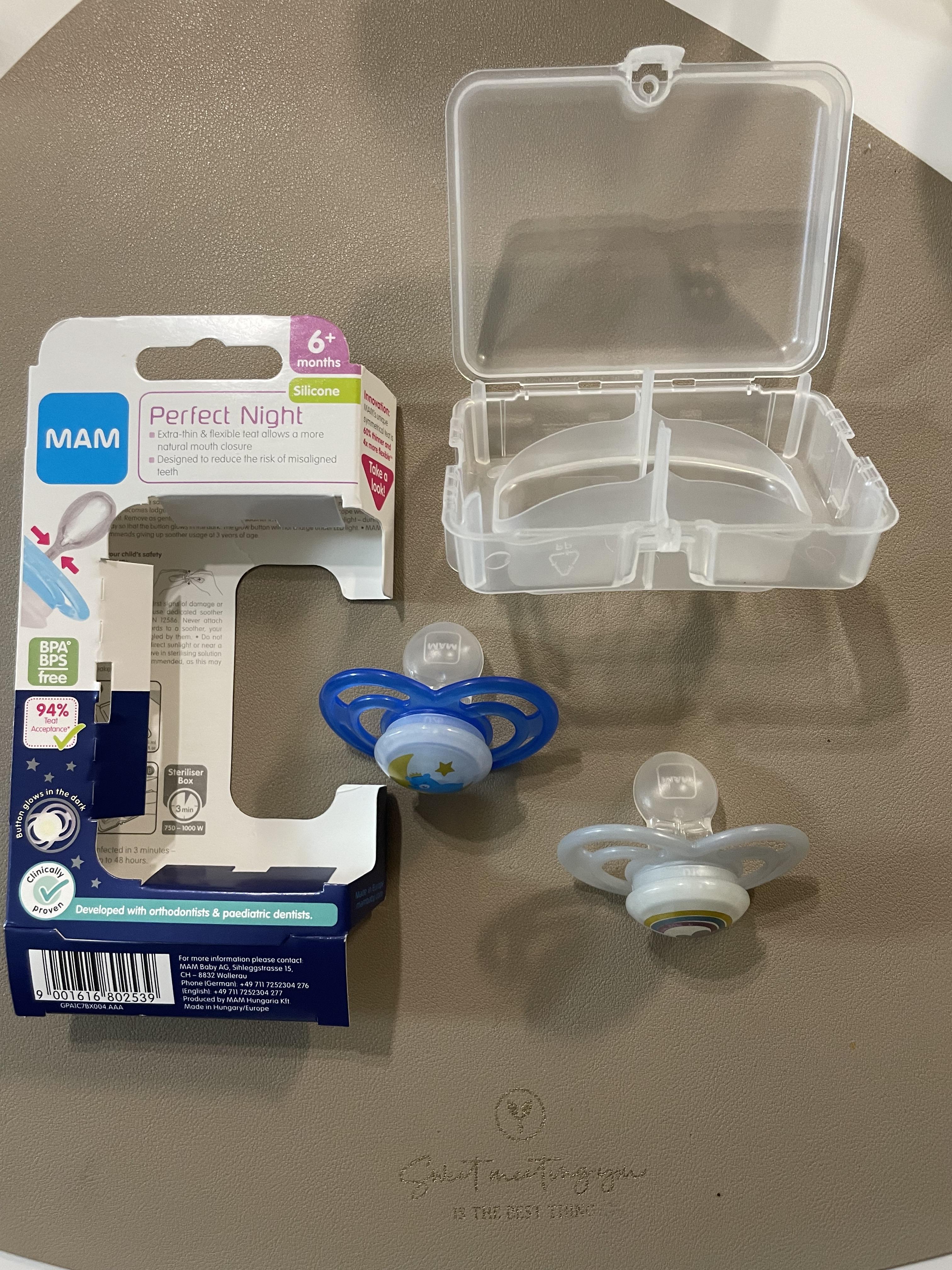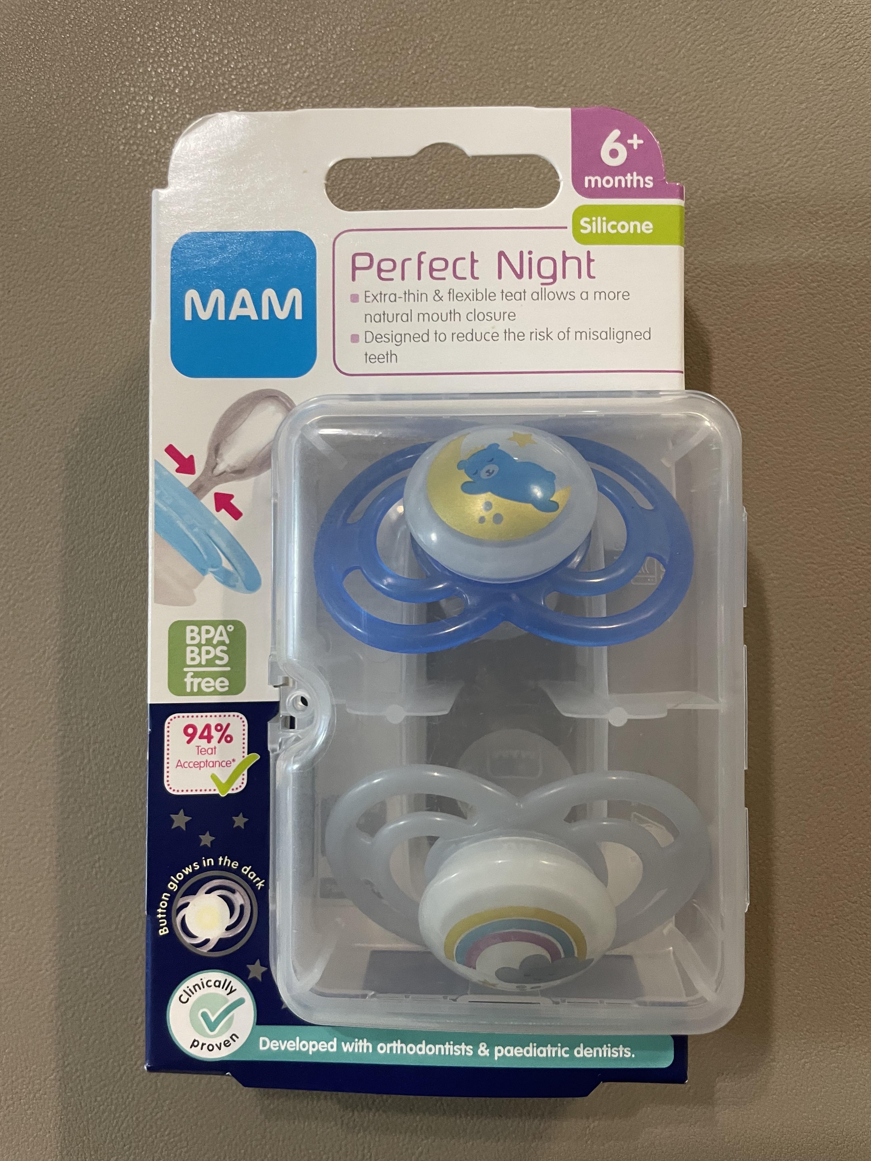 40년 이상의 역사를 가진 독일 맘베이비의 'MAM Perfect Night' 제품으로 쪽쪽이 뒤쪽 버튼이 야광이라 어둠 속에서도 잘 찾을 수 있다는 장점이 있습니다. 세세하게 설명하지 않아도 이미 유명한 제품이라 넘어가도록 하겠습니다.