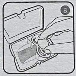 먼저, 상자를 잡고 25ml/0.9floz의 물을 표시된 선까지 채웁니다.(그림 A) - Next. place soother(s) in the box with the teat facing down (fig. B)